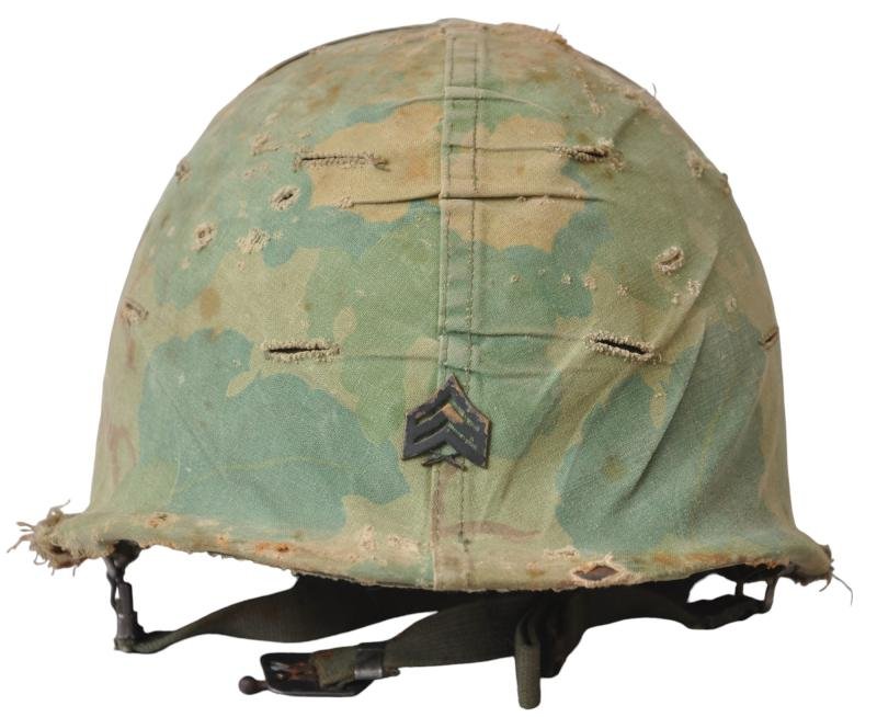 A Vietnam period USMC helmet with camouflage cover & Airborne liner of the 'Tet Offensive' period . This rather 'salty' combat helmet displays hard wear throughout with its cover well stained & worn through constant use. One tongue still shows a partial part of its contract number to underside. The liner has a mid green overpaint this being a classic USMC adornment with the Gunnery sergeant rank insignia to front indicative of a long serving veteran Marine. Liner cradle marked with a '64 date & DSA contract number. The female buckle is minus.