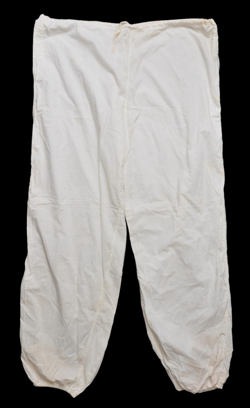 A very good pair of the ' TROUSERS,WHITE CAMOUFLAGED ' Size No.3 . Issue with the white smock listed seperately they are complete with label bearing WD broad arrow mark & manufacturer 'JD Fieldman & Co Ltd' . Date 1943. An approx 42in waist with 32in inside leg. No rips or tears.