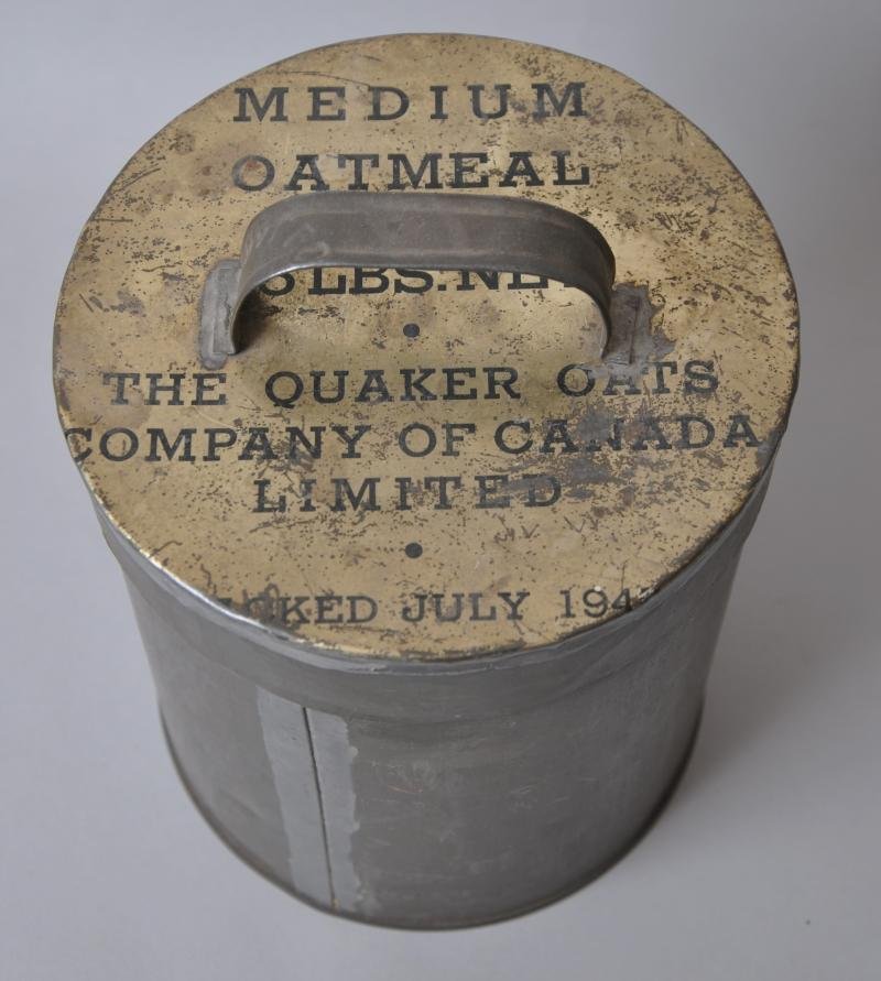 Rare Canadian ration container of 'Medium Oatmeal' , from the 'Quaker Oats Company of Canada Limited' with date which appears to be July 1945 . Measures 6 inches across & 7 inches high ( not including handle).