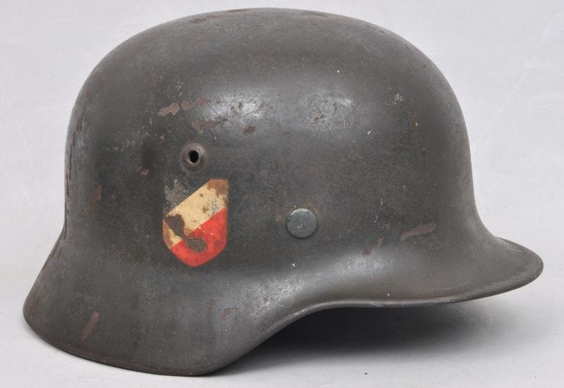 A recently surfaced double decal Luftwaffe helmet coming straight from an attic in Europe. Helmet is a model 35 with second pattern eagle & tricolour shield to right side. Shell is finished in the classic blue of the Luftwaffe this having darkened slightly with age . All of the three liner pins retain their original blue colour & are totally undisturbed. Luftwaffe eagle shows some age tone with tricolour shield having some scuffing but overall still very visible. Leather liner is very good & intact & complete with its original drawstring , I have made no attempt to lift it. Maker mark & size to shell 'Q64' with batch number to rear rim appearing to be ' 694' . Finally , the chinstrap is in the early brown leather of the luftwaffe with Luftwaffe inspection mark 'LBA' to underside. This has been cut at the centre & quite possibly the result of having been removed from an injured soldiers head or belt kit .
