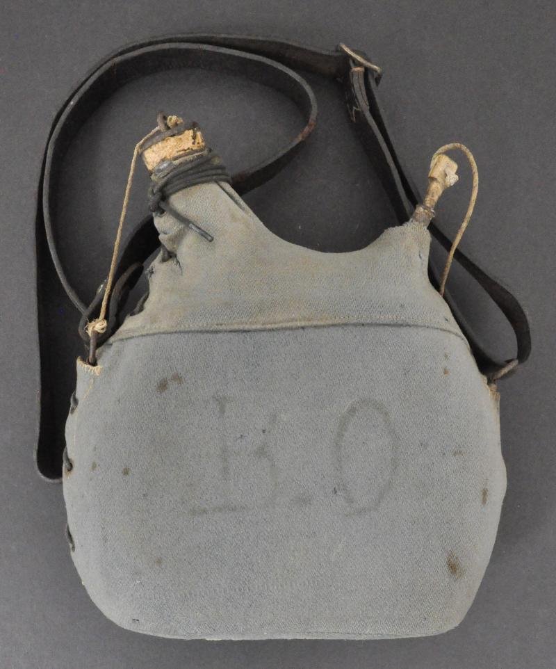 A WW1 French 2L waterbottle in light blue material & in quite excellent condition. Made of a smooth blue almost felt like wool this is yet another excellent example of the myriad of different materials used in the construction of items from this period & indicative of the late 1914 early 1915 period when the standard uniform colour was changed to light 'Horizon' blue as we know it now. This size of 2 Litre bottle was on general issue to front line combat troops as of 1914 thereby replacing the scarcer 1 Litre version which was used prior to the outbreak of WW1. Off white nametag to bottom , name washed out , leather carrying strap still supple & with early brass buckle & stud indicative of the earliest of issues.