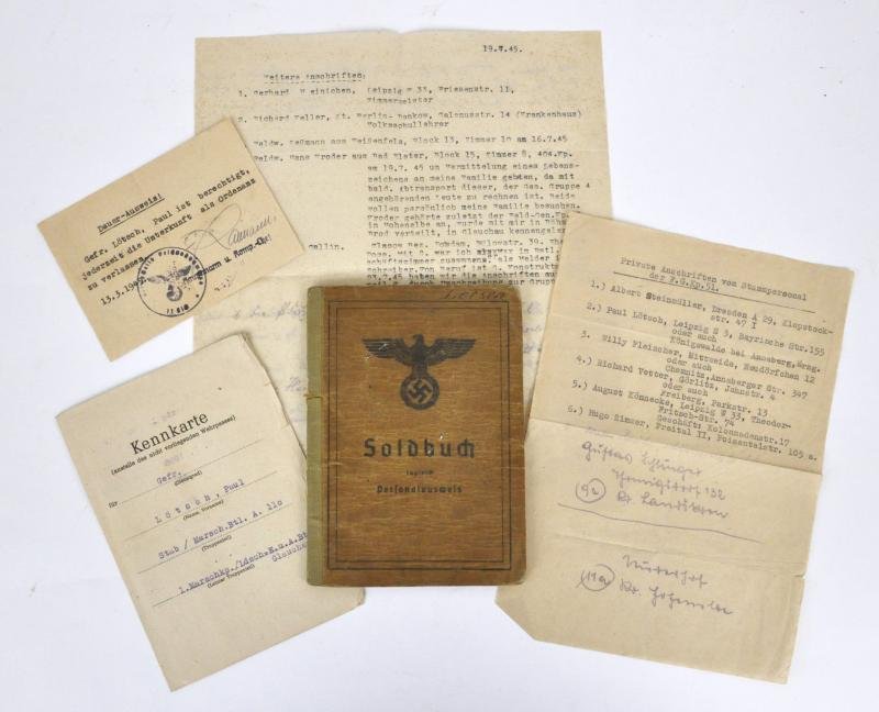 Interesting German army Soldbuch with many entries including one to a machine gun battalion of a fortress unit 'Festung-MG-Btl.72' towards the end of the war. Various entries in this book regarding units served ( Beginning with Landshutze Battalion ) with much accompanying paperwork still contained within the covers. Shows kit issue of various items with 'Pistole' Training entry & interestingly issue of Anti gas equipment ' Hautengiftungsmittel , Verbandspackchen & Gasplane ' on 6th February 1945.