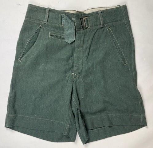 A pair of the German army HBT 'Drillich' shorts in green for army issue . Excellent near unissued condition with integral waistband still intact. Dice stamped size markings to waistband area with maker & date ' Kersten 2 43' . ( February 1943).