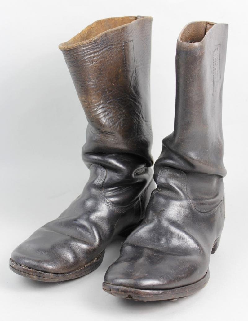 A pair of midwar period German marching boots that have been well worn & would be perfect for mannequin display. The midwar date is apparent from there leather saving shorter height. Both boots have good leather & have been field repaired at varying points with heavy wear to soles. Small split to leather to right boot . These boots are visually identical for use on a mannequin & most likely worn together for soem time however upon close inspection it is apparent that they are not quite a matching pair.