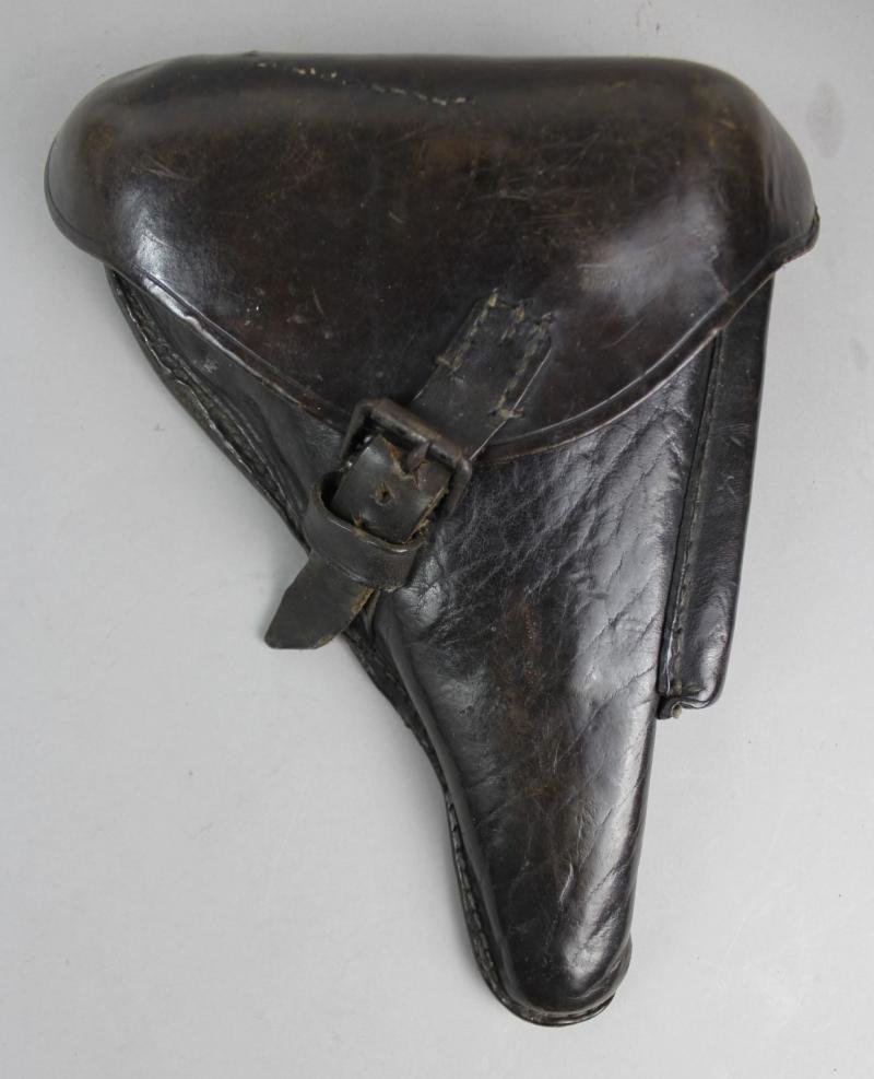A WW1 period German P08 Luger holster in black leather & with faint maker mark stamp toi underside of flap. All stitching is firm & original to the holster.