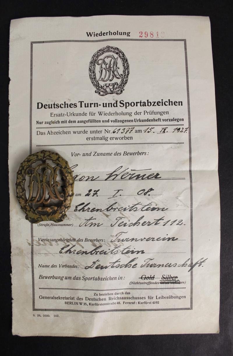 German Sports badge with award document named to Egon Werner who was born on 27th January 1908. Badge maker named to 'Weensteen' & DRGM marked . This is the first type of Sports badge made without swastika .