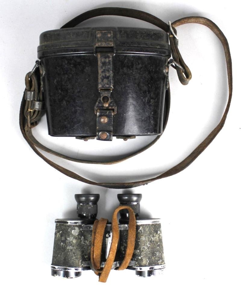 An early pair of WW2 German 6 X 30 Dienstglas complete with neck strap & black bakelite case having shoulder strap manufacturer marked & dated 1940. Dientglas have excellent graticled optics & are made by 'cag' with cold weather blue dot & nomenclature ' Dientsglas 6 X 30 No. 19743 H/6400' . Bakelite case is undamaged & with original hard to find buckled shoulder strap . THis is marked & waffenamt stamped at pointed end to the maker 'C.POSE WEHRRAUS=RUSUNGEN 1940 ' . There is also a clear waffenampt stamp to one belt loop.