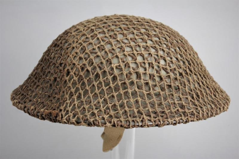 A British double netted camouflage helmet this being the 'MKII 2C' with three holes drilled into the rim to denote a lesser ballistic resistance than the standard MkII issue. A totally untouched piece the owner has applied two camouflage nets , one on top of the other to enhance its camouflage effect. Beneath this can be seen the helmets original rough khaki paint finish to inside & out with BMB maker ( Briggs Motor Bodies ) & 1941 date to rim. Liner is in good order with top nut firm & undisturbed . Chinstrap is of the midwar one piece MkIII issue .