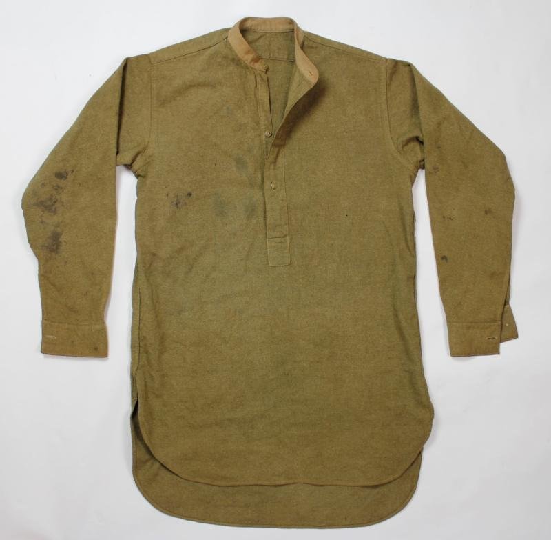 Collarless battledress shirt as worn under the battledress by British troops. One cuff minus its button & some grubby marks to front.