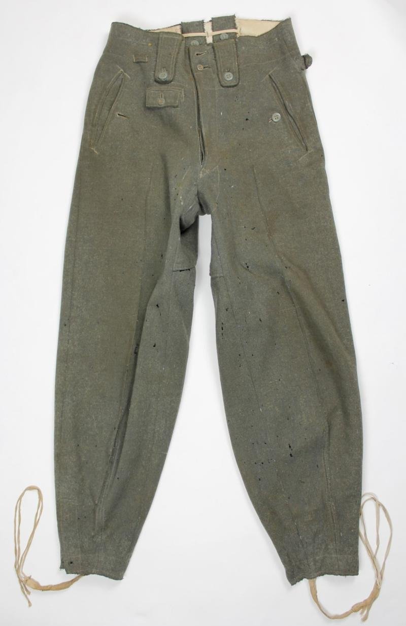 Rare pair of German 'Keilhose' M43 Waffen-SS trousers in used condition with moth holes. A textbook pair of the SS issue M43 trousers they feature straight cut side pockets & seat particular to those of SS issue. Green buttons to belt loops & front fly intact with leg ties to both ankles. One button minus from right side straight pocket. There are alot of moth holes to both legs & waist area please study the images so you are fully familiar with the condition of these trousers before purchasing.