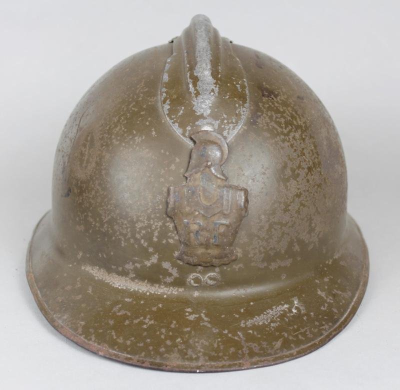 A French Engineers M26 Adrian helmet as was worn by French troops in the Summer of 1940 during the Battle For France . Fewer of the specialist branch M26 helmets exist compared to that of the infantry thus making this quite a rare Adrian. Helmet is in the brown factory paint of earlier M26 productions , later issues were in a darker green towards the outbreak of WW2. As is typical with early helmets an M15 Engineer badge has been applied with the blue paint overpainted in khaki to match the rest of the helmet. Liner & chinstrap both present . Showing heavy wear throughout & more than likely a veteran of the Summer 1940 fighting.