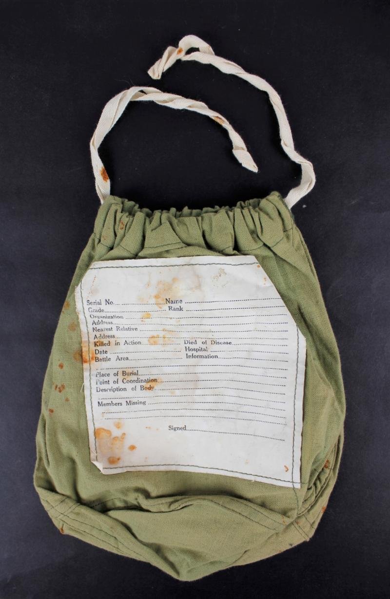 A personal effects bag used by Graves registration personnel in which would be placed items of soldiers who had been killed or died in hospital for return to next of kin. On the green canvas bag is a cloth label on which the details of the deceased & circumstances would be written.