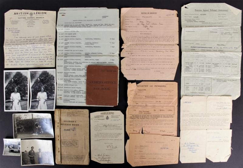 A fascinating British army AB64 paybook grouping to an infantry soldier who was in combat in the Western Desert , N.Africa & Normandy serving as a Bren Gunner in a Carrier platoon. As a result of all this he appears to have suffered combat stress & was sentenced to Military prison time following Court Martial. Initially volunteering for Boys service in 1935 he joined the Suffolk Regiment in September 1938 & served with them until october 1942 . During this time he did Parachute training with 151 Parachute Battalion in Delhi before returning back to the infantry at his request . He then saw service on the NW Frontier, India before then seeing action in the Western Desert & N.Africa in 1942 where he had treatment for bad nerves. He then served with the Queens Regiment before joining the Hampshires in April 1944. His actual landing date in Normandy is slightly confusing as his medical record states he was first wave of assault troops on D Day with 38 days of heavy action following this . His Pensions record of December 1946 shows a slightly different date of landing in Normandy on 16/6/44 however this may well be a civilian error which was certainly not uncommon in even the immediate postwar years. Either way he fought heavily at Arromanches & Le Hamel with the 43rd Wessex Division or the 50th Northumbrian Infantry . After very heavy fighting one day he was ordered to join another section for more fighting but felt that he ' could manage no more without rest ' & was subsequently court martialled. He served 237 days in a Detention Barracks but this was suspended following medical reports. The Medical officer writing this report states that he believes problems started with the mans health following an earlier exhaustion breakdown after being in action in N.Africa. Within the group there are various letters relating to his Pensionable service & Medical report along with some personal family photographs. A fascinating grouping to a man who was in heavy combat in the early days of the Normandy fighting at Arromanches & Le Hamel & who in todays understanding was apparently suffering from combat stress as a result of this .