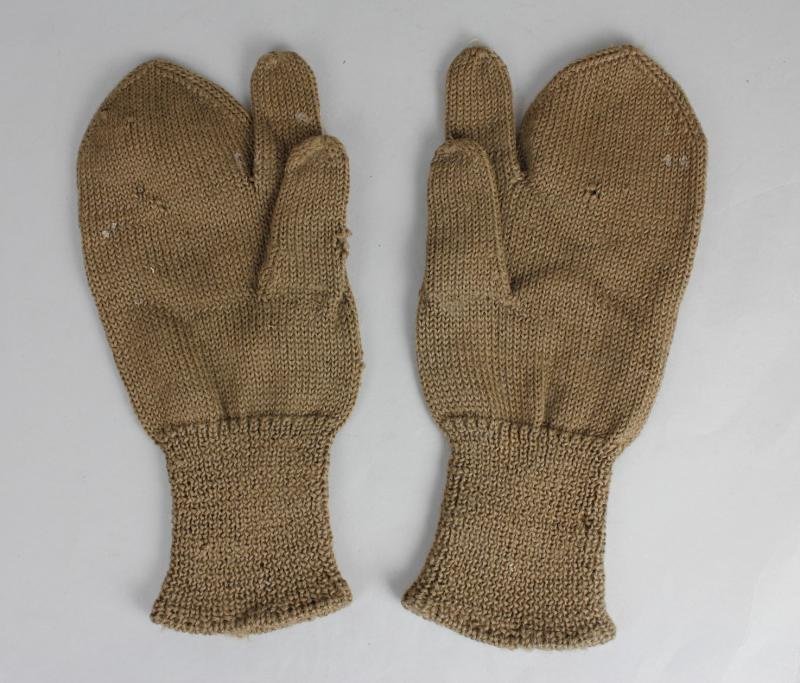 WW2 British army khaki wool mittens with trigger finger. Well used with holes .