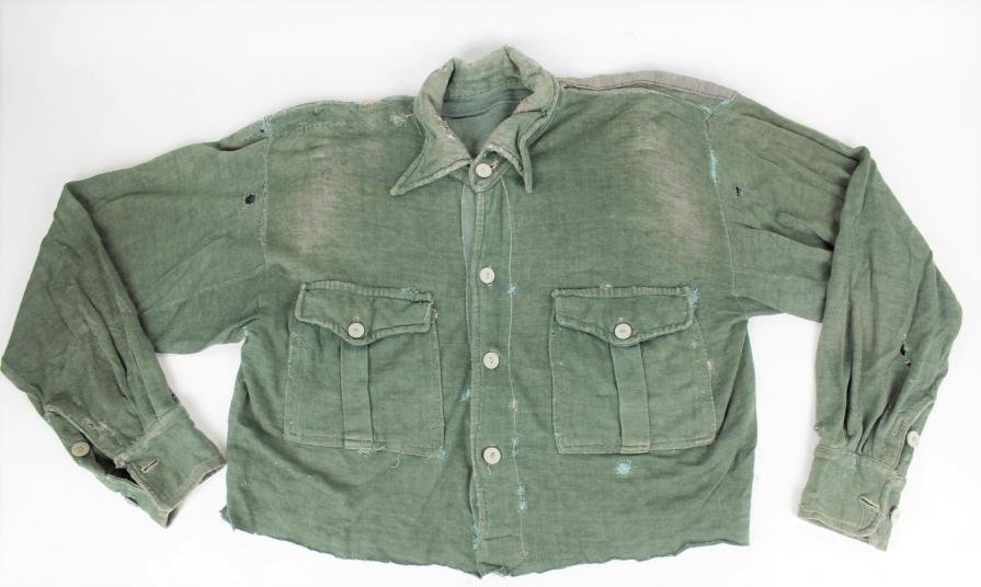 A German army shirt of the M43 style in green rayon wool with all of its pressed card buttons present to half fly , chest pockets & cuffs. This shirt has been cut off just below the pockets however would still be perfect for mannequin display underneath a tunic or parka etc. Well worn item coming from a very old collection with holes to rear some fraying & patch repair to rear shoulder area.