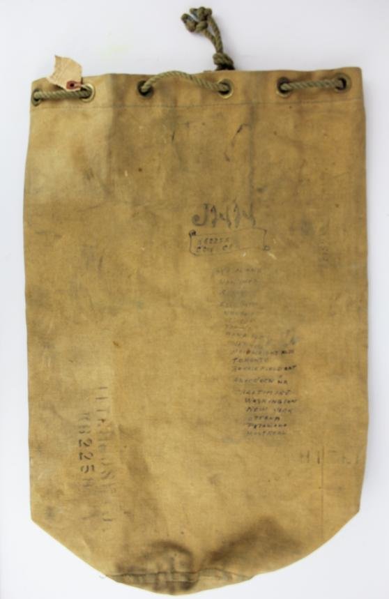 Interesting kitbag formerly belonging to a Canadian soldier which has been decorated with the placenames of where he has served as well as his initials 'JWW' & his army number & unit ' K622SB C Coy CSK ' . Under this are written the names including Montreal, Toronto, barriefield Ont, Aberdeen, Baltimore, Washington, New York, Ottawa to name but a few. Attached to the kitbag is a period transit tag with the soldiers name & his unit apparently being the RCEME ( Royal Canadian Electrical & Mechanical Engineers ) based at Petawawa Camp, Ontario, Canada. Maker name to inside of bag is Woods MFG Co Ltd , 1918.