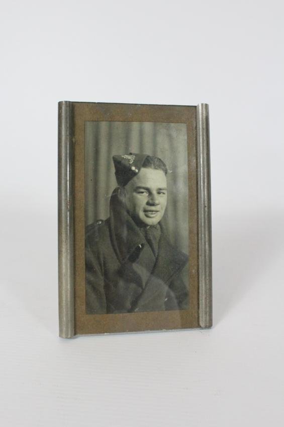 Straight off of a 1940s' mantelpiece this portrait photograph is of a Royal Artillery soldier in FS cap, scarf & greatcoat. Untouched from the period , it is mounted into a simple metal edged frame & has been untouched for many years.