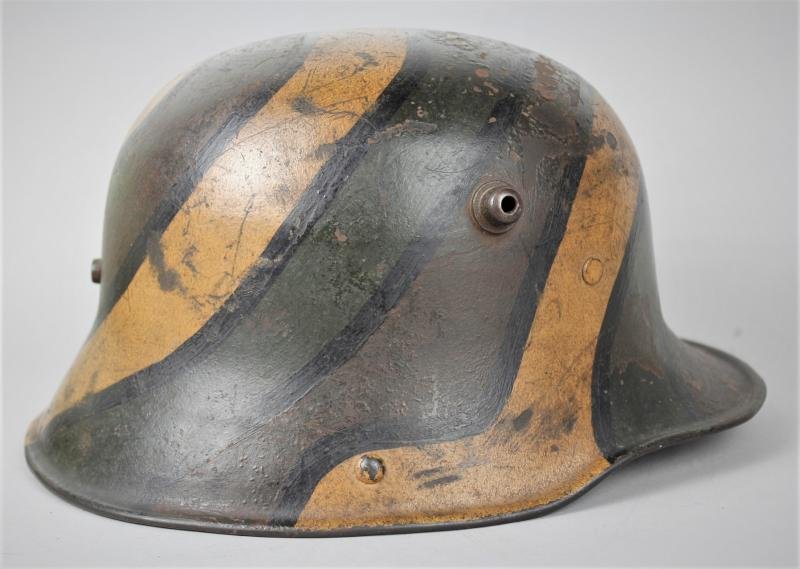 A fabulous Leutnant named German M16 camouflage helmet with a striking handpainted three tone swirl camouflage scheme to its exterior. Finished in tan ochre , forest green & brown the scheme has been applied with each segment seperated by thick black dividing lines these sweeping down & around the helmets entirety to great effect. All three of the helmets liner pins remain intact & uninterfered with this much evidenced to the interior where the arms of the pins are well seated into the leather M16 band. All three of the cushion pad holders are present & remain undamaged. Tightening cord intact. Of note is the officers name painted to the underside of the rear rim which although slightly appears to be ' Leutnant Beimann '. The 'Bell L' maker mark is visible with the size an apparent '64'. Overall very striking helmet froim the German trenches of the Great War .