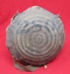 Original era manufacture. An an 1863 pattern Federal 'Bullseye' canteen which was repurposed after the war for continued service. Tan canvas cover with the number 280 stenciled on one side, and 49 on the other. Remnants of a canvas shoulder strap with a brass adjusting buckle remain. At some point in the canteen's life the pewter spout deserted it's post. All three of the original sling securing loops remain however.