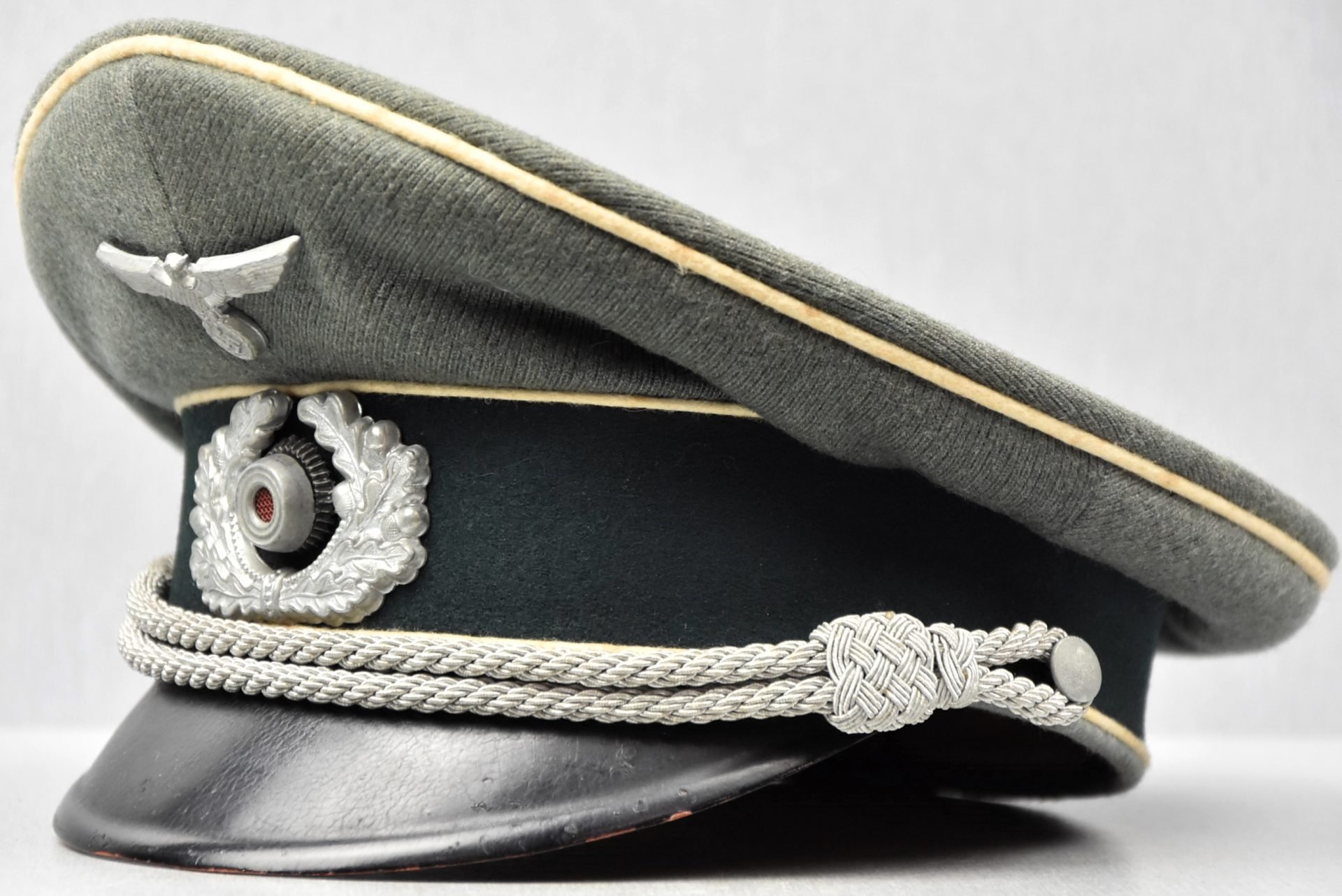 Amazing army officer visor cap (SchirmmΓΌtze) in excellent condition. Late war made cap, with the Erel logo present on the sweatband. The logo on the diamond seems to be never there. Size tag present 56 1/2. Typical vented cocarde on the front which can be seen with all of the caps of this firm. No damages, shows light wear.