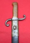 Original era manufacture. An interesting sword with little information on it's heritage. Possibly of Brazilian use, and attributed to artillery units. Chassepot pattern blade with Alcoso scale proof on the ricasso. Overall the blade is clean with minimal spotting and staining. Dramatic S-shaped steel guard with flat sides, the reverse being marked 240, A.G.R.J. in stamped numbers and letters. Deeply ribbed brass grip. Black leather bodied scabbard with sound stitching, brass throat and chape. Normal age and wear.