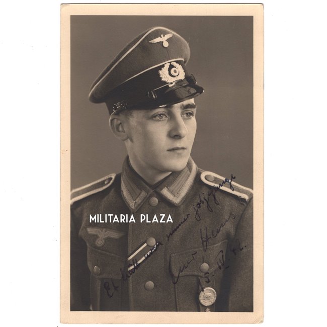 This is a nice Wehrmacht (Heer) portrait photo. Nice portrait of a Wehrmacht NCO 'Unteroffizier' wearing his M41 tunic and visor cap. A ribbon for the Iron Cross 2nd Class is sewn through one of the buttonholes of his uniform and he is wearing a Silver Wound Badge (Verwundeten Abzeichen) and a miniature Hitler-Jugend Proficiency Badge in Silver (HJ Leistungsabzeichen) on his chest. The photograph is in excellent condition and measures approximately 14 x 9 cms (postcard size). There's something written on the photo and it is dated 15 April 1942. Nice original Wehrmacht portrait-photo.