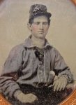 Original period manufacture. 6th plate ambrotype in a half case. Waist up view of a Civil War soldier wearing a nicely piped sailor type shirt, with an oilcloth cover on his forage cap. Image is quite clear and lightly tinted.