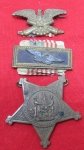 Original era manufacture. Of a pattern adopted at the 1874 National Encampment (Harrisburg Pennsylvania), to honor those who served as past officers within the GAR. The light blue edging on the flag ribbon denotes a service at a Post level.Numbered on the edge, age and wear, separation of the ribbon from the medal and the eagle.