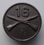 Original period manufacture. Darkened bronze disc with 16 over crossed rifles. The 16th Infantry served with the 1st, 'Big Red One' in France during WWI. Stock photo, minor details will vary.