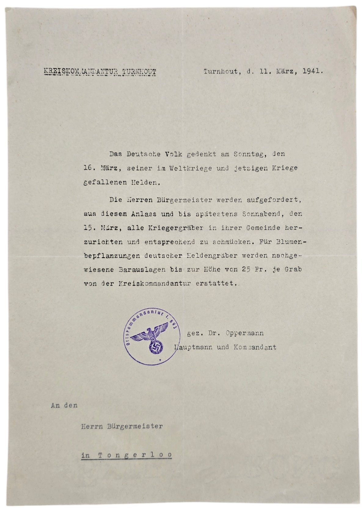 Original WW2 Belgian Document - Kreiskommandantur Turnhout remembering the fallen soldiers, Tongerloo (1941)