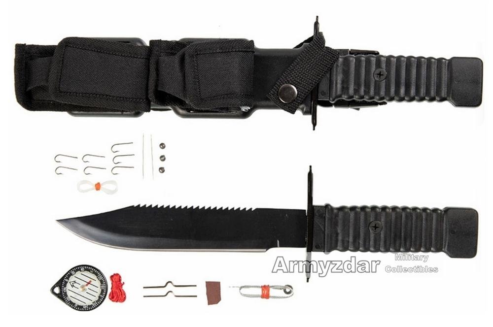 This is a nice survival knife with extensive survival equipment: compass, fishing hooks, needles….