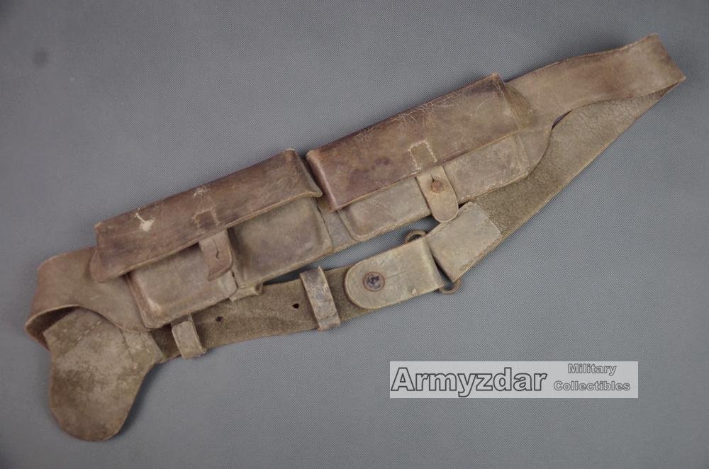 This is a good used Italian army ammo bandolier. This type made from brown leather was used in WW1. On steel pin missing as you can see on front picture.