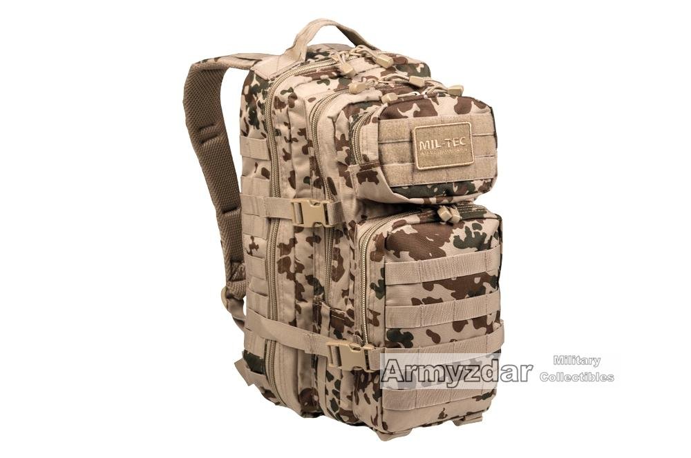 Assault Backpack has two main pockets with small inner pockets. All pockets have 2-way-zippers. The backpack has adjustable belly strap in length with quick release fastener. The ergonomic formed padded shoulder straps are ca. 5 cm wide, adjustable in length.