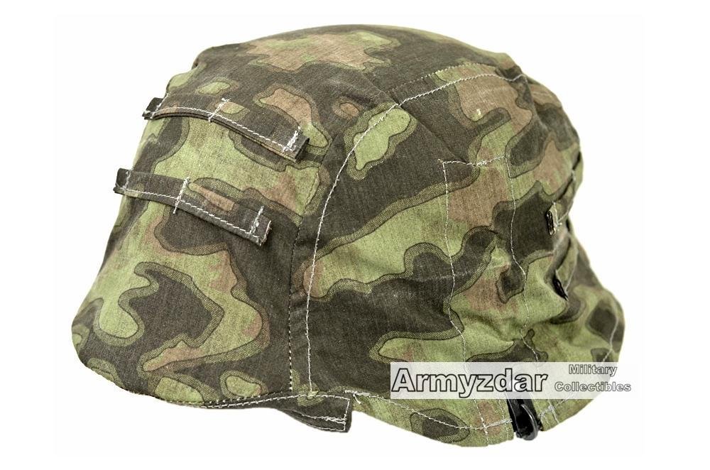 This is beautiful german SS M1942 reversible helmet cover. This type has sewn loops for comouflage. The cover was made from “rauchtarn” camo fabric and the springs are covered by ” eichenlaub A” camo.