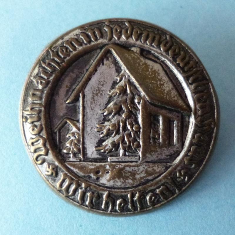 Pressed-tin circular (30mm dia) pin-back donation-badge showing a house with Christmas tree and the surrounding legend 'Weihnachten in jedem deutschen haus - Wir helfen !' (Christmas in every German house - We are helping !) Minor wear to the finish but very good condition.