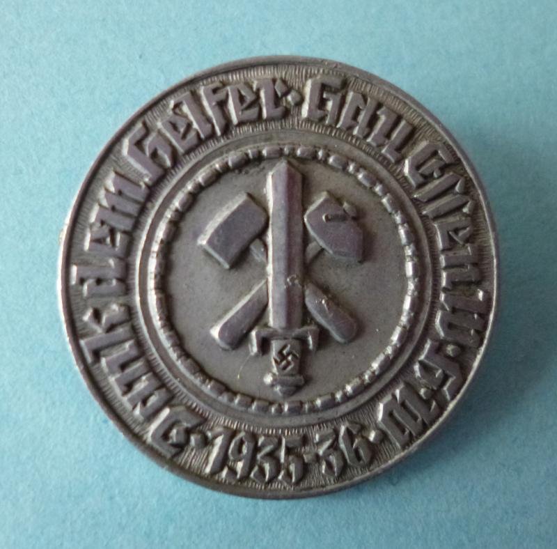 Small round (28mm dia) aluminium-alloy pin-back badge in recognition of support for the Winter Relief Work in Gau Essen over the winter of 1935-36..The centre shows the Gau-Essen badge surrounded by the legend 'Dank dem Helfer - Gau Essen WHW 1935-36'.No maker mark. Excellent condition.
