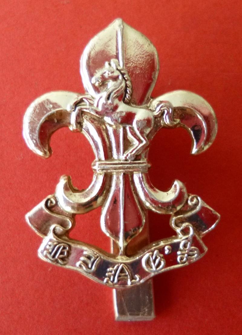 Anodised aluminium cap-badge with the pre-2001 gothic script title-scroll. The reverse has a slider-fixing which has been cut short by the badge's original wearer. The slider is stamped with 'J.R.Gaunt B'ham'.