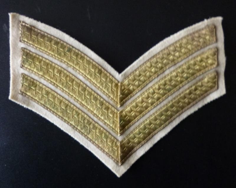 Three gold wire-braid chevrons stitched to white backing with khaki cloth on the reverse with six press-studs for fastening to the uniform.