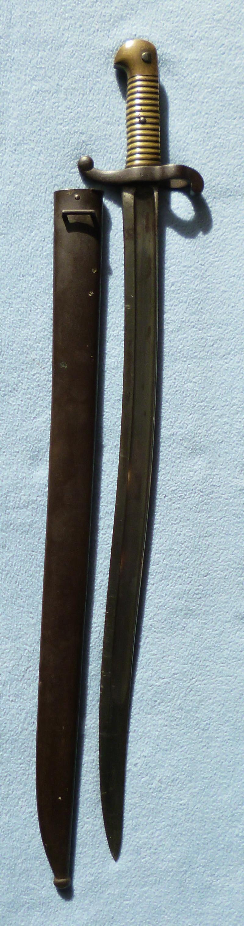 This brass-hilted hefty bayonet was the predecessor of the more common Model 1866 'Chassepot' bayonet. Grooved cast brass grip with working spring clip. Overall length of the bayonet in its steel scabbard is 71cms. The scabbard has no dents or dings and the bayonet blade is clean with only minor age staining. The back of the blade is engraved with the abbreviated French state arsenal name and date 'Manufacture Imperiale de Châtellerault - Janvier 1864 - Sabre Bayonet Mod.1842'. There are numerous numbers and inspection marks on the bayonet grip and the scabbard throat is numbered '217'. A nice example. PAYMENT BY CHEQUE OR BANK-TRANSFER ONLY PLEASE. BUYERS OVER 18 YEARS OF AGE ONLY. UK CUSTOMERS ONLY - I WILL NOT POST WEAPONS ABROAD.