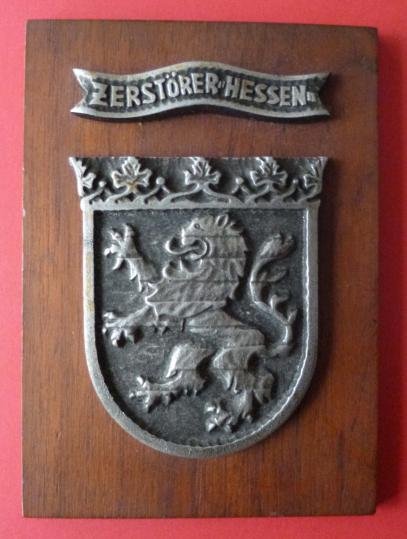 Cast silver-grey metal ship's emblem and title scroll 'Zerstörer Hessen' mounted on a rectangular wooden plaque measuring 19cm x 14cm.. The reverse of the wood is stamped with 'Blohm + Voss, Hamburg'. Excellent condition.