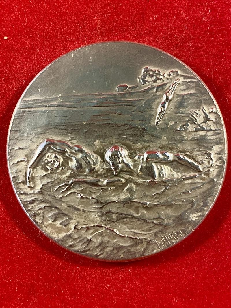 Here on offer is silver Sea Cadet Corps, National Championships swimming medallion by F. Phillips of Aldershot. Presumably awarded for a swimming competition sometime between WW1 and WW2 but I can't be certain as it's undated. On the front, it has a detailed engraving of two swimmers in the water with another jumping into the water in the background. It is also stamped F. Phillips Aldershot, near the lower edge. On the reverse it has the Sea Cadets Corps insignia and motto, with Sea Cadet Corps National Championships, in raised lettering around the edge. I believe this impressive circular medallion has been cast from sterling silver by the famous medal maker's, F. Phillips of Aldershot, albeit it isn't hallmarked. This medal is truly a fine quality piece that is in beautiful condition, with some slight discolouration to the silver that would polish bright if required. It measures 1.5” (3.8cm) diameter and weighs 26g. Please see my pictures for the details of the condition, which complement this description. Please see my TERMS OF BUSINESS regarding Deliver Charges and Insurance regarding additional insurance cover, should you require it, BEFORE the item is dispatched. The responsibility lies with the customer to check with your Customs restrictions that this item can be imported into your country. Thank you for taking the time to look.