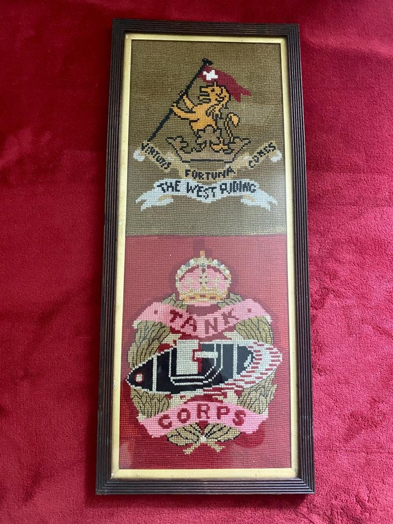 Large Framed WW1 Embroidery Panels Depicting the Duke of Wellington's Regiment (West Riding) and The Royal Tank Regiment