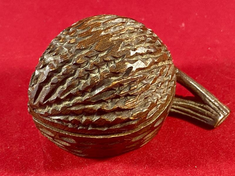 Here on offer is an interesting and beautifully carved walnut shaped Black Forest wooden inkwell, that I was told relates to a German prisoner of war detained in Portugal during WW1. The story goes that when Portugal went from being a neutral country to entering WW1 on the side of the allies in 1916, they interned 36 German and Austro-Hungarian ships in Lisbon. Then on 9th March 1916, Germany declared war on Portugal followed by Portugal declaring war on Germany and they start to organise Portuguese troops to go to the Western front. This meant that number of German sailors and civilians where detained in POW camps in Portugal. They were allowed to take in some personal items such as writing equipment with them. The base of this inkwell has been carved with the name of a Portuguese town, PEDRAS SALGADAS and the year 1916. Therefore, I believe this inkwell is an antique and was made in the Black Forest (Switzerland) c1900 and was owned and used by a German POW in a camp at Pedas Salgadas, during WW1. Inkwell itself has been deeply carved and hinges open to reveal a whole where originally a glass liner would have been fitted, which is now sadly missing. The hinge works well and is a bit loose on the top section. (two nails need tapping in). The lower section has a metal pin that helps locate and hold down the lid, when it's closed. The Inkwell is in excellent condition and the wood now has a nice dark patina to the finish. It measures 3.5β (9cm) wide by 2β (5.2cm) deep and 2.25β (5.7cm) high and weighs 34g. Please see my pictures for the details of the condition, which complement this description. Please see my TERMS OF BUSINESS regarding Deliver Charges and Insurance regarding additional insurance cover, should you require it, BEFORE the item is dispatched. The responsibility lies with the customer to check with your Customs restrictions that this item can be imported into your country. Thank you for taking the time to look.