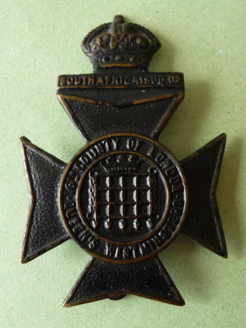 Pre-1922 blackened brass King's crown cap-badge complete with slider-fixing on the reverse. Nicely detailed non-voided type with only minor wear to the black finish. Formed in 1908, this battalion was merged with the 15th in 1922 and the badge changed.