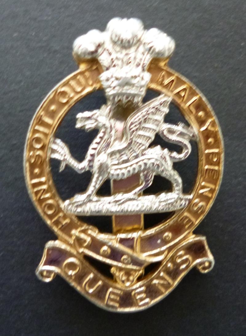 Bi-metal anodised aluminium cap-badge of riveted construction with a slider fixing on the reverse. The slider is stamped 'J.R.Gaunt B'ham'. The badge has been worn. The Queen's Regiment (QUEENS) was an infantry regiment of the British Army formed in 1966 through the amalgamation of the four regiments of the Home Counties Brigade. Until 1971 the regiment remained one of the largest regiments in the army, with 10 battalions, however these were reduced to just 6, and later 5 battalions. Following the collapse of the Soviet Union, the Options for Change reforms were published and in 1992 the regiment amalgamated with the Royal Hampshire Regiment to form the Princess of Wales's Royal Regiment.