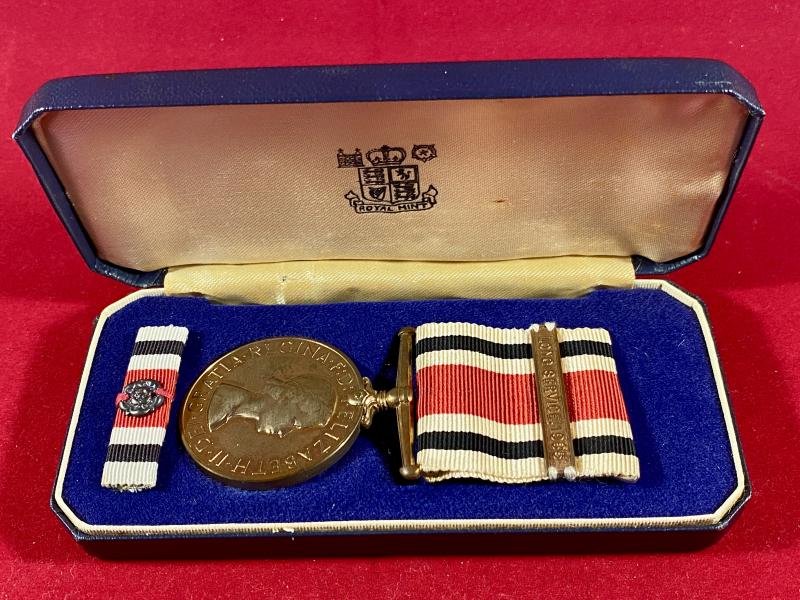 Here on offer is an original Elizabeth II - Special Constabulary Long Service Medal with 1985 Bar. It also comes with a Rosette Ribbon Bar and its original presentation case. It was presented to JAMES H. GRITT and his name is stamped on the lower rim of the medal. I believe the 1985 medal bar was awarded for an additional 10 years of continuous service. This medal also comes with the rarer Rosette Ribbon Bar, set with a silver rosette. This represents the fact a bar was awarded to the owner. The medal and the ribbon come with the original fitted presentation case. It has a silk lining under the lid with the Royal Mint crest, indicating it was made at the Royal Mint. The Special Constabulary Long Service Medal is a long service medal awarded in the United Kingdom to members of the Special Constabulary who have completed a specified period of service. These medals where established on 30th August 1919 by King George V. The medal was initially established as the Special Constabulary Medal. The intent of the original warrant was to recognize the service of the members of the Special Constabulary during WW1, with further regulations to recognize nine years of service as a member of the Special Constabulary. A new Royal Warrant was promulgated in 1920 changing the name of the medal to the Special Constabulary Long Service Medal. The medal was usually awarded to all ranks in the Special Constabulary for nine years unpaid service, with more than 50 duties per annum. War service with at least 50 duties counted as double. For those Special Constables who served during WW1 the medal was awarded for three years' service, and had performed at least 150 police duties. The gilt bronze medal is in excellent condition and retains all its gilt finish, which now has a nice age patina to the finish. It is unusual to find a complete set like this with a Rosette Ribbon Bar and original case. The full-size medal measures approximately 1.4” (36mm) diameter. With the case it weighs 130g. Please see my pictures for the details of the condition, which complement this description. Please see my TERMS OF BUSINESS regarding Deliver Charges and Insurance regarding additional insurance cover, should you require it, BEFORE the item is dispatched. The responsibility lies with the customer to check with your Customs restrictions that this item can be imported into your country.