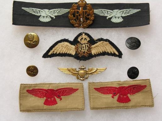 A rare grouping to an RAF Sergeant Pilot Jack Coller. Trained on flying boats by the U.S. Navy. The grouping consists of the following :- His graduation U.S. Navy Pilot Wing engraved 'Sgt J.J.Coller RAF 7-3-42 in sterling silver and 1/20th gold filled, pin back by Amico. WWII RAF period RAF pilot wing removed from uniform penned on the reverse Coller. One pair of Tropical RAF eagles in silk thread. One pair of RAF regulation RAF eagles in silk thread. One enlisted RAF cap badge. Four King's crown RAF buttons 2 small and 2 large each example is in brass and bakelite. Naval Aviator certificate named to 'Sgt Pilot Jack J Toller' dated 3rd July 1942 it has been laminated measures 13 3/4' x 10' note the mis-spelling of Toller not Coller. RAF photo dated June 1941 also laminated. Photo of an RAF Sunderland Flying boat also laminated.