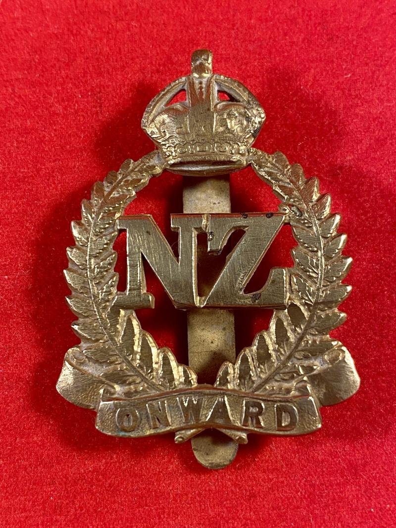 Finely Detailed New Zealand Expeditionary Force âONWARDâ Brass Cap Badge with Kings Crown