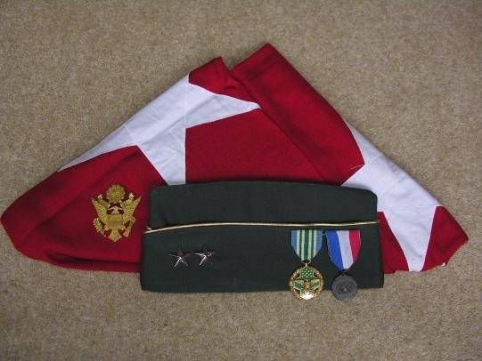 A small grouping of items from MG Heiden who was the Commanding Officer of 1st Squadron 10th Cavalry 4th Infantry Division Vietnam from 1967 to 1968. and Commanding Officer, 3d Brigade, 1st Armored Division, from 1969 to 1970. So we have the following items:- 1. Two Star Generals Flag maker marked and stamped. Measures 3' x 4' 2. Two Star Generals Garrison Cap made by Flight Ace. Gold trim with two stars, with service wear. 3. Named Joint Services Commendation Medal. 4. West Point Medal.
