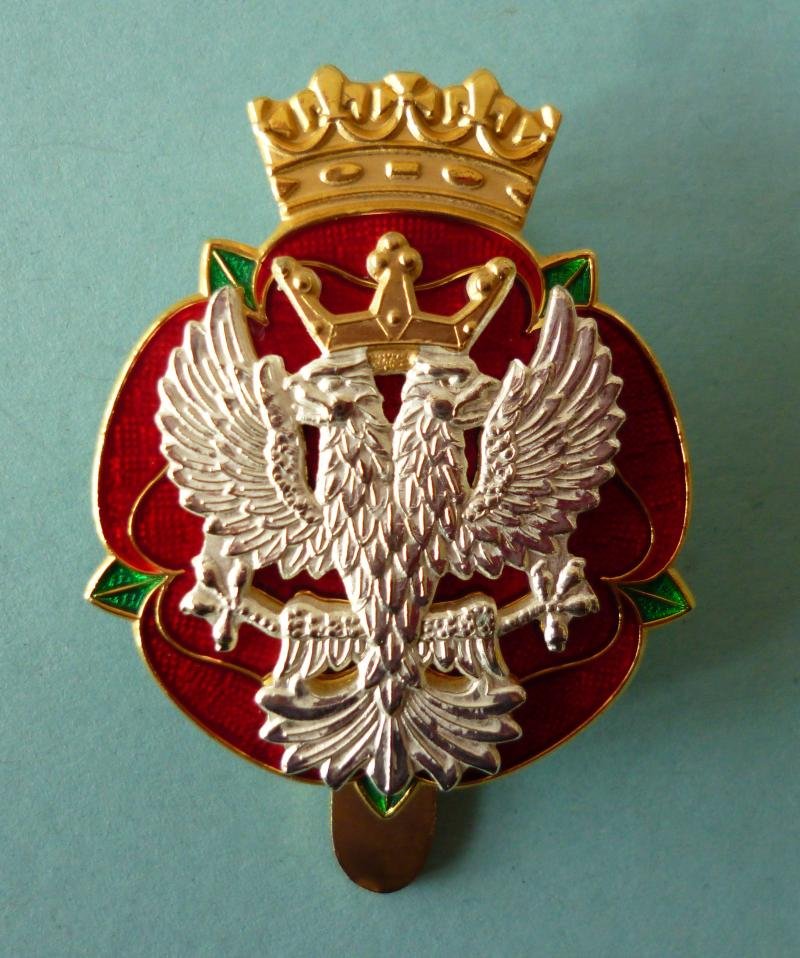 Gilt metal and enamel consisting of a red enameled Lancastrian rose surmounted by a gilt ducal coronet. Superimposed on the rose is a separately attached silver double-headed Mercian eagle. The reverse has a slider fixing and is double stamped with the maker's marks of 'Firmin'. The badge is complete with its original Firmin packet of supply. Mint condition.. The regiment was formed in 1992 by the amalgamation of the two earlier yeomanry regiments and the cap-badge was introduced in 1994.